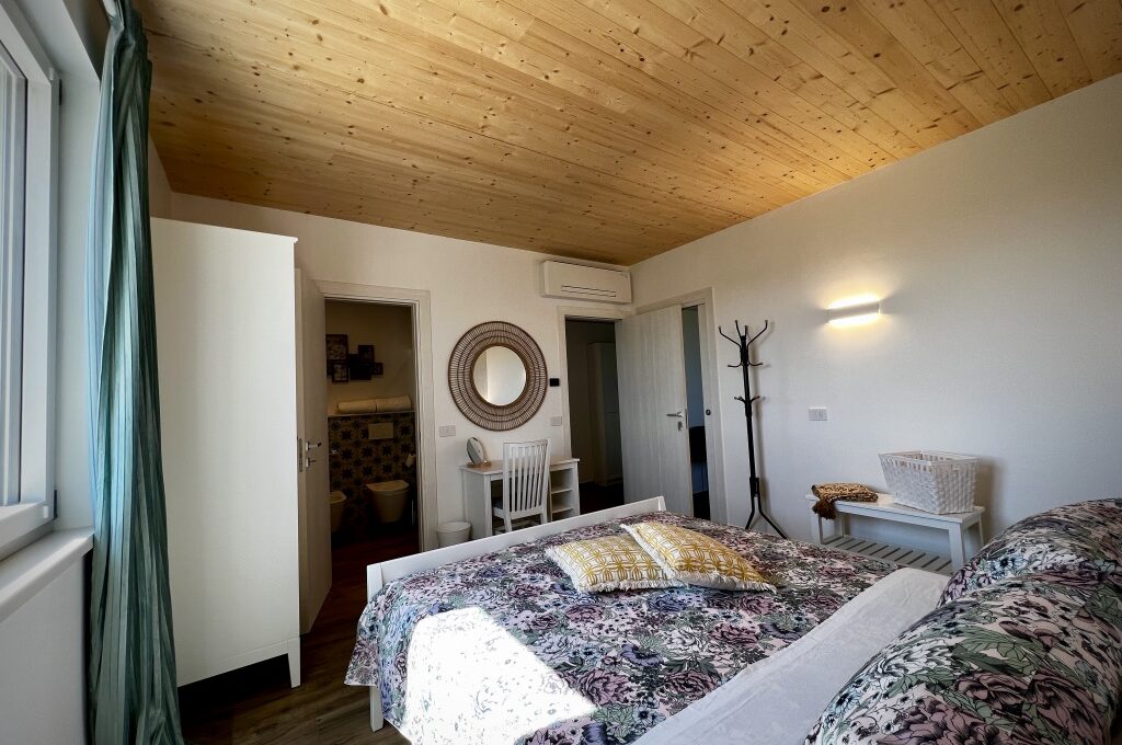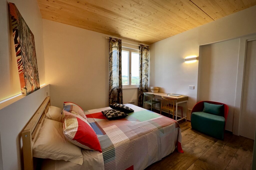 La Camera dei Fiori, ideale per famiglie di 4/5 componenti, è composta da due camere con due accessi indipendenti, due letti matrimoniali e un lett0 singol0. Dispone di bagno privato con ampia cabina doccia e biancheria da bagno inclusa. La camera offre un ambiente accogliente e confortevole, con aria condizionata e Wi-Fi gratuito, per garantire privacy e comodità agli ospiti in un contesto immerso nella natura e nei panorami circostanti del casale.